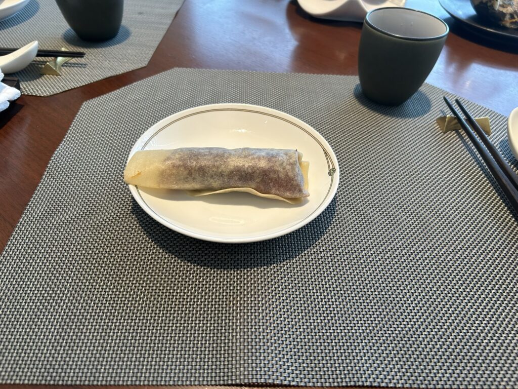 コースのハイライトとして登場したのは、飴色に輝く丸ごとのダック。 切り分けられる前のその姿は美しく、見るだけで期待値が跳ね上がる。 そして嬉しいのが、スタッフが「最も美味しい状態」に巻いて提供してくれることだ。 自分で巻く楽しさもあるが、ここではプロの手ごたえに身を委ねる。口に含むと、パリッとした皮の食感、濃厚なソース、そして脂の旨みが一体となって押し寄せる。上品なのに、脳裏に焼き付くインパクト。これぞ「名物」だ。