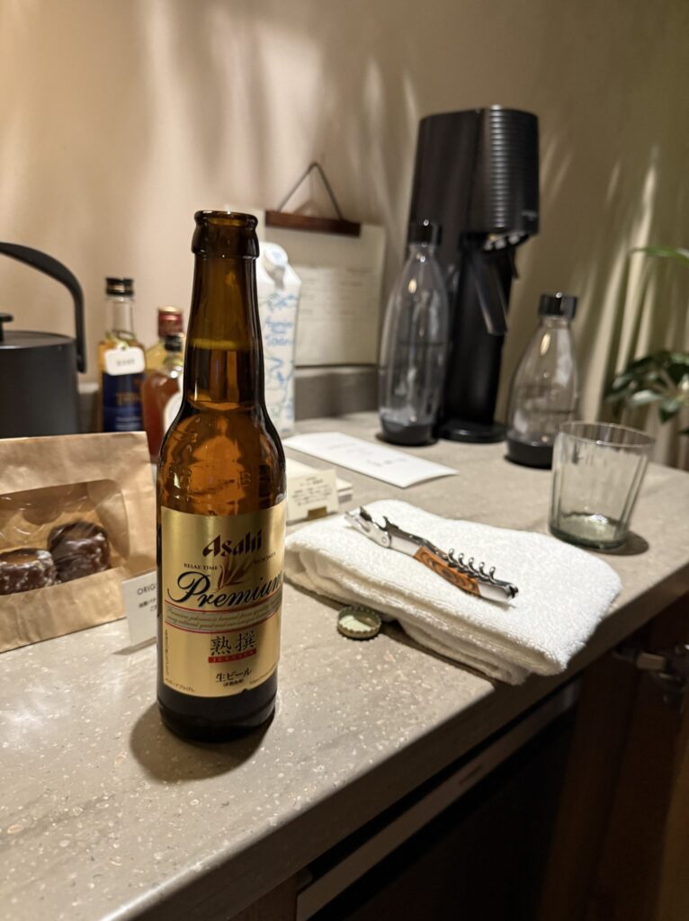 到着してすぐ温泉に入り、冷蔵庫のフリービールで喉を潤す。
