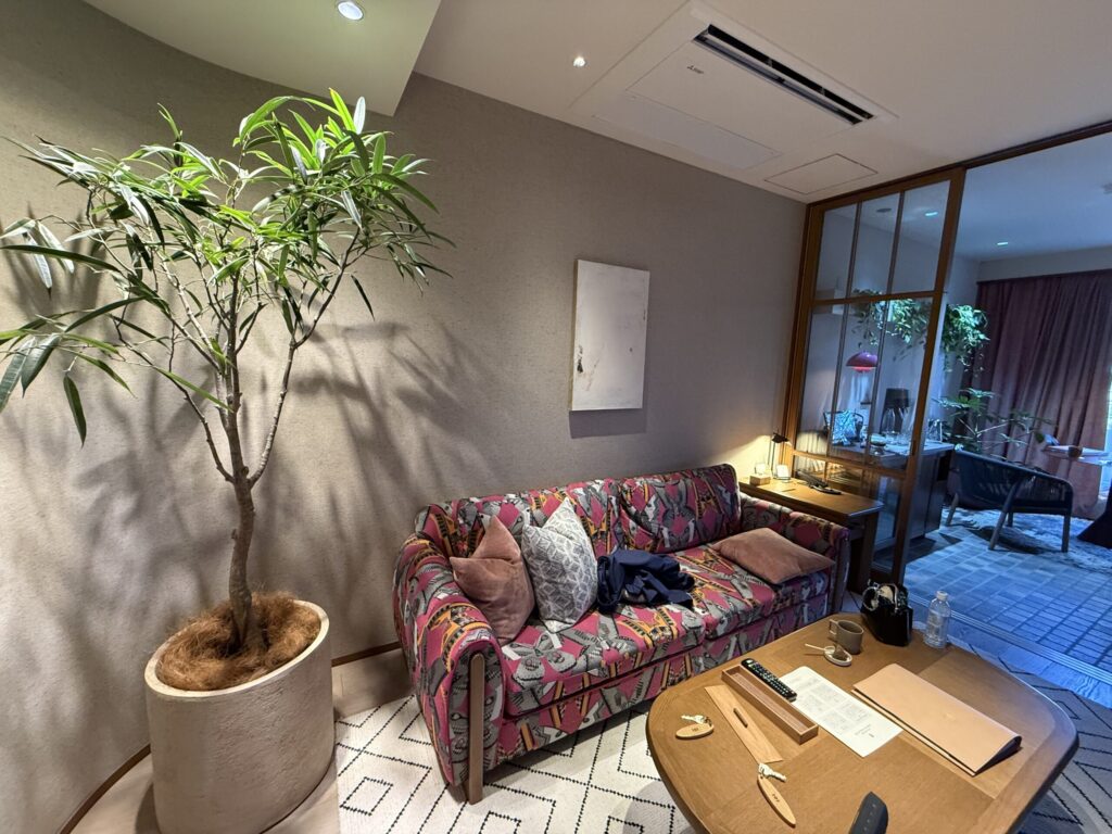 部屋だけでなく廊下やラウンジにも植物(グリーン)を配置することで、視覚情報が途切れず、脳が「人工的な空間(緊張)」に戻る隙を与えません。これにより、交感神経の活動が抑制されたまま、深い休息状態をキープできます。