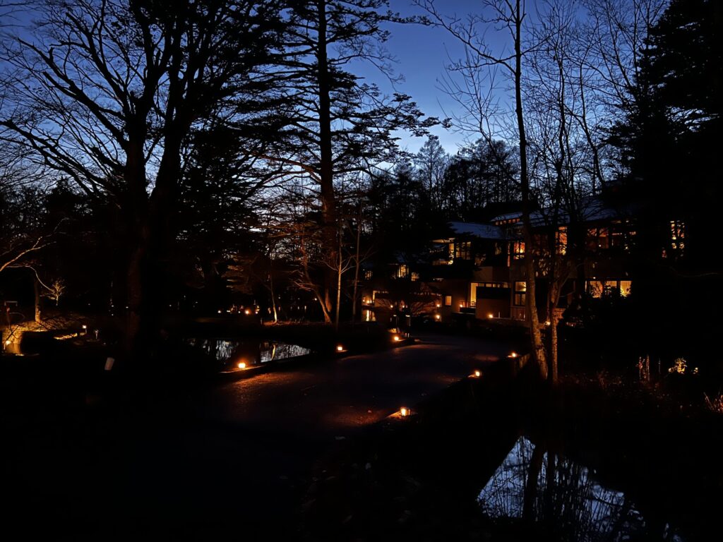 星のやの夜の照明は、徹底して低い色温度(オレンジ色の光)と低い位置に抑えられています。