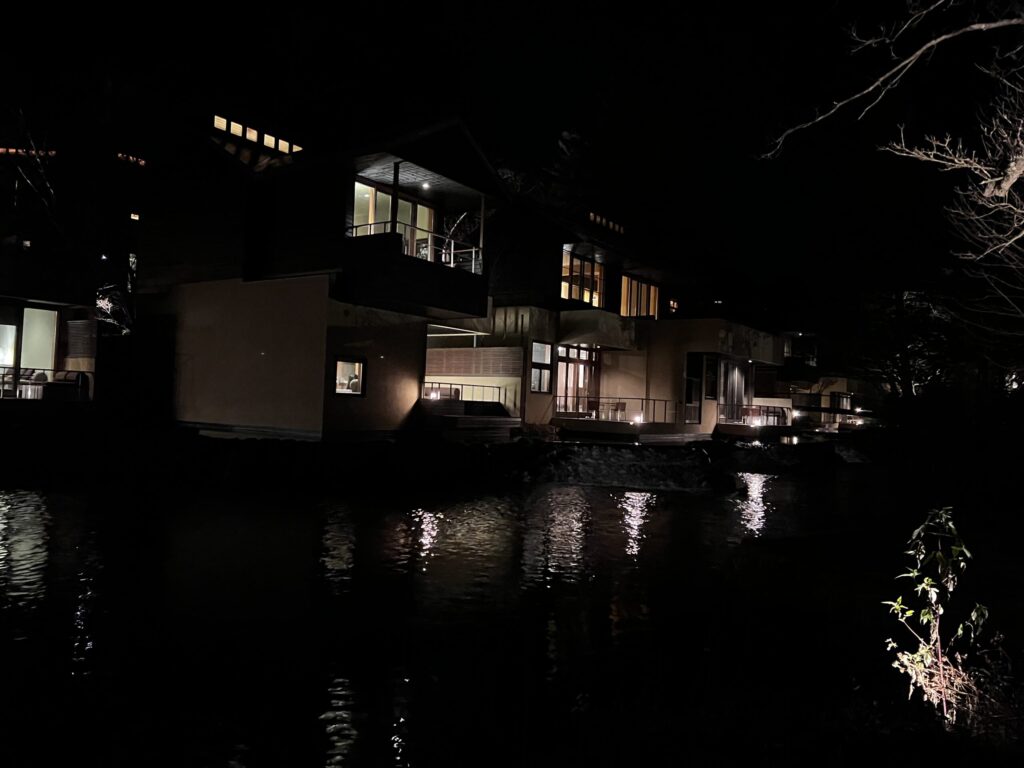 川の音を聞きながら、間接照明に照らされた水辺を歩く。