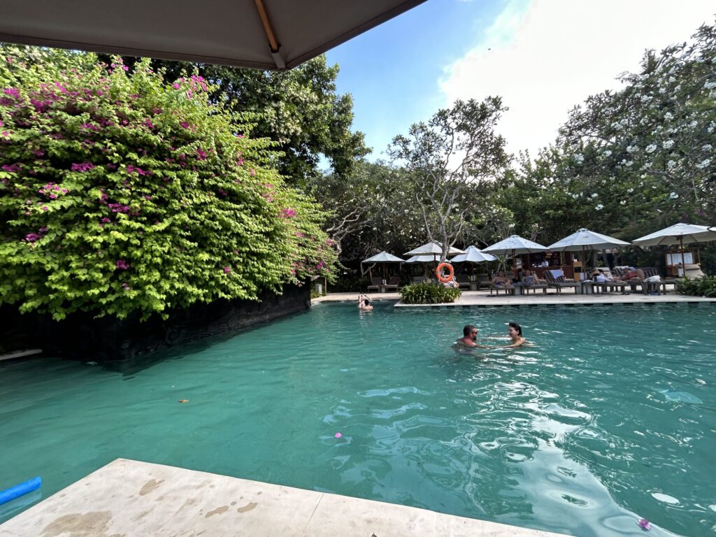 朝食は「Omang Omang」で。ここは文句なしにおすすめです。 バリらしい中華麺やフルーツの豊富さはもちろん、味のクオリティが日本と同じレベルで安定しています。 何より、プールと庭を眺めながらの朝食は「リゾートに来た!」という実感を何倍にも高めてくれます。