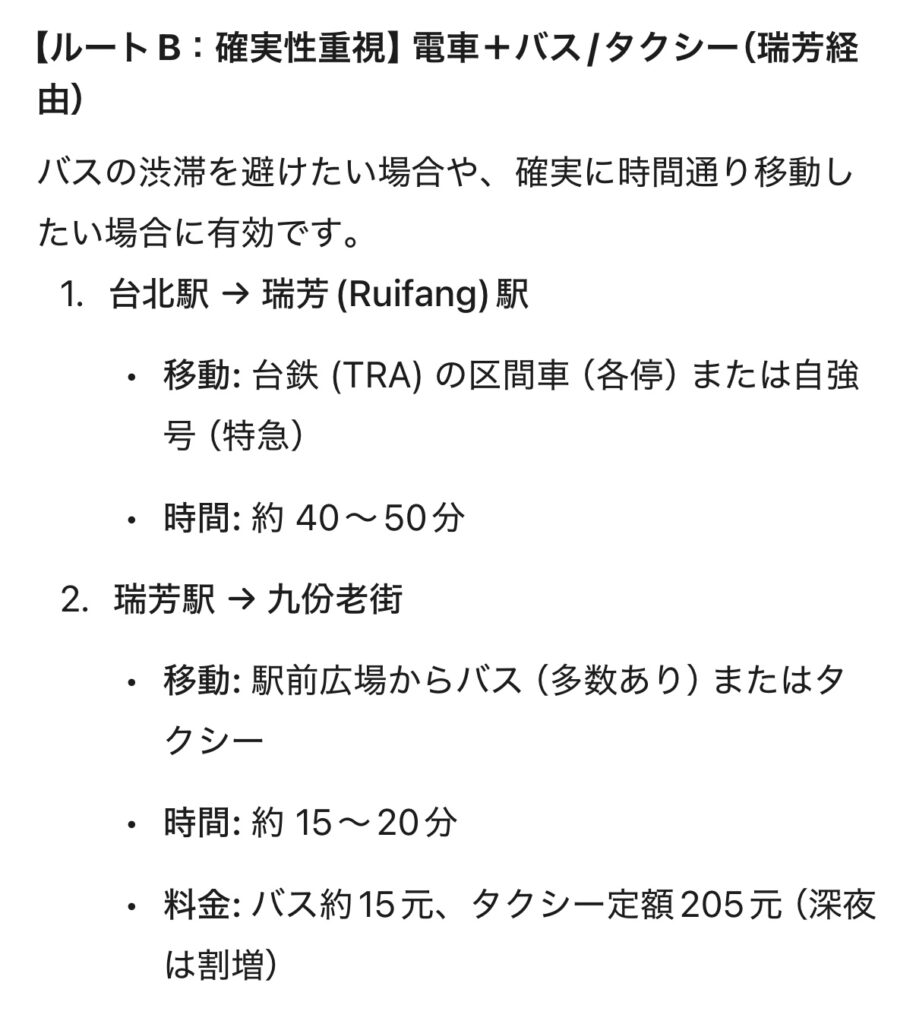 結局、私たちを救ったのはGeminiがサブ案として出していた「プランB:瑞芳(ルイファン)駅経由」でした。