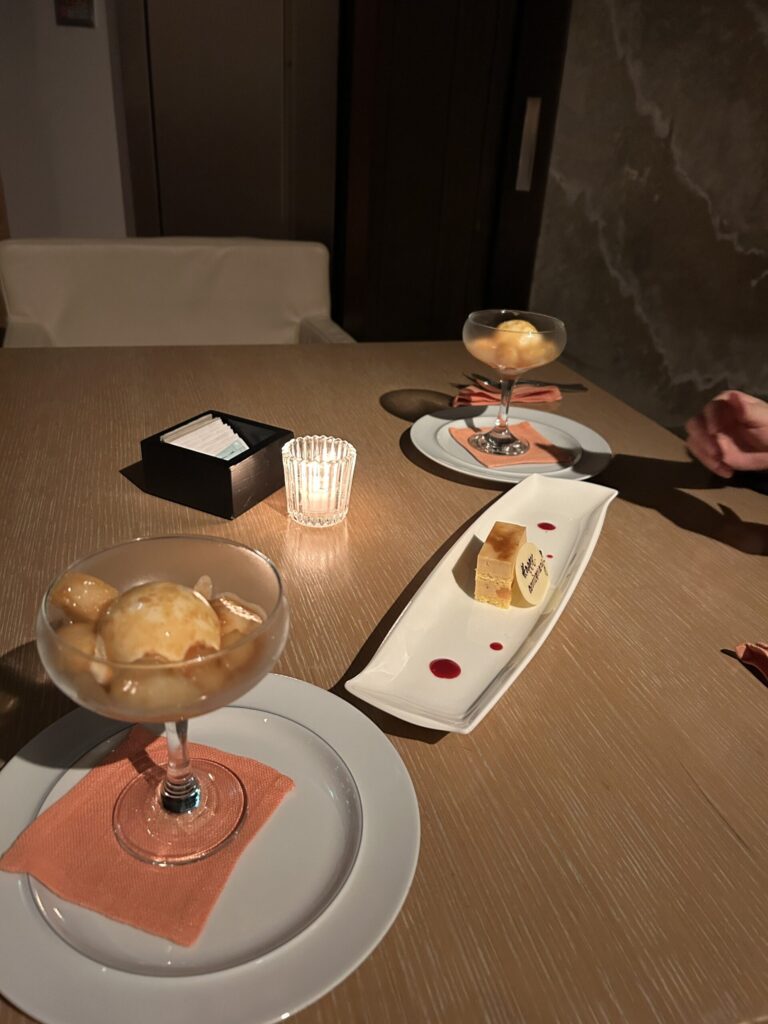 食事を終えると、デザート専用の席へ案内される。 鉄板の熱気から離れ、ゆったりとした空間で甘味を楽しむ。この「場面転換」のおかげで、新鮮な気持ちでコースを締めくくることができた。