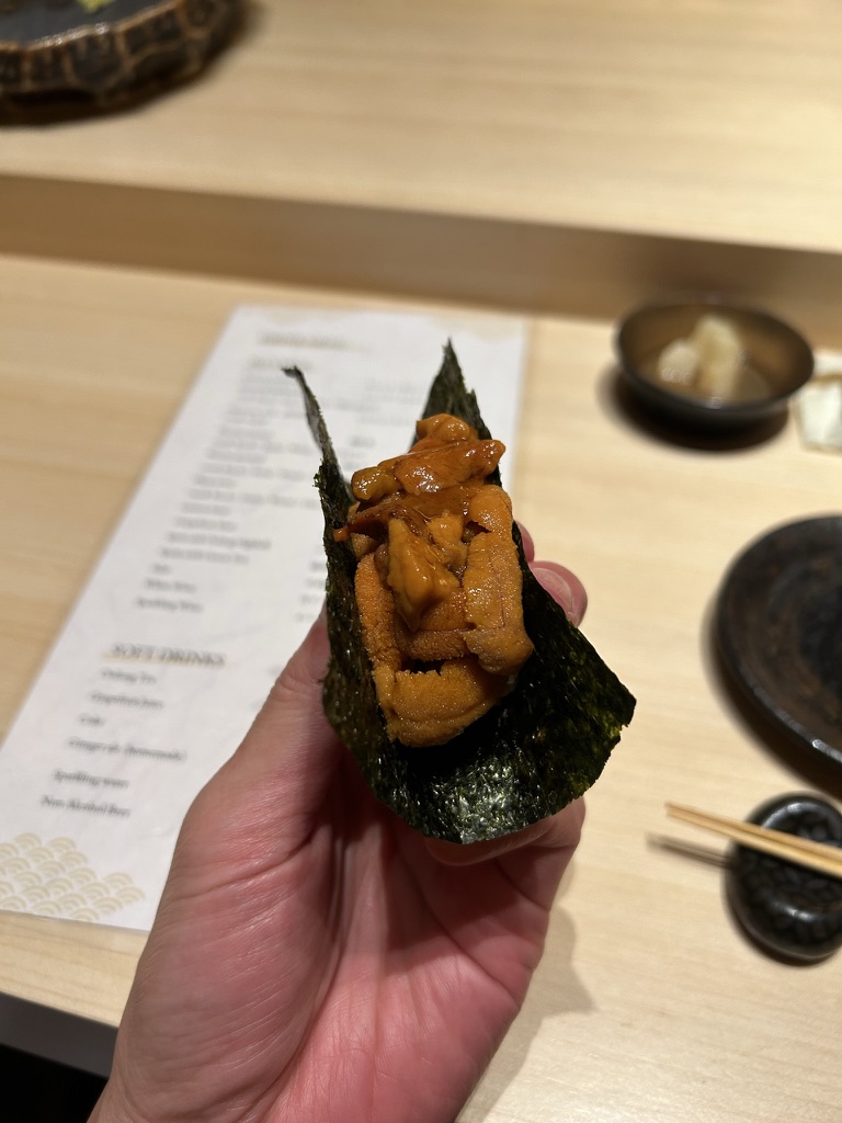 ウニの手巻き 手渡しされたそれは、ウニが溢れんばかりに乗っている。量も鮮度も、こちらの予想を良い意味で裏切ってくる。