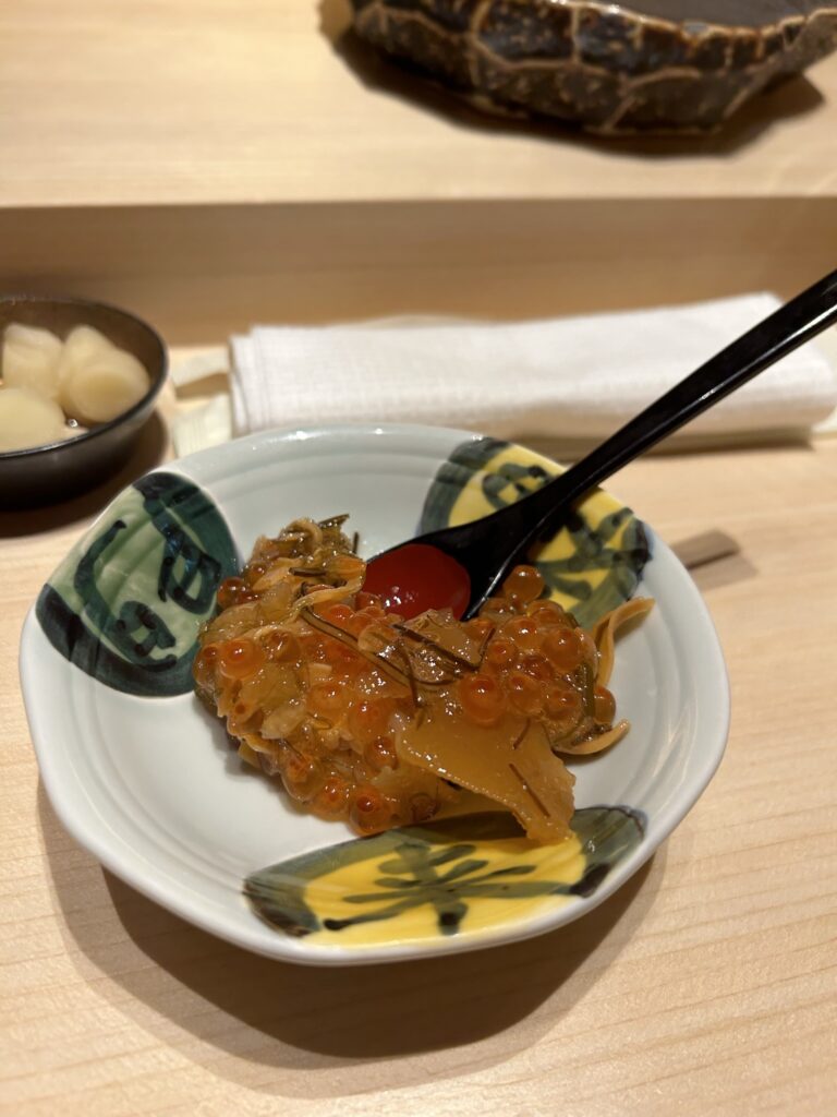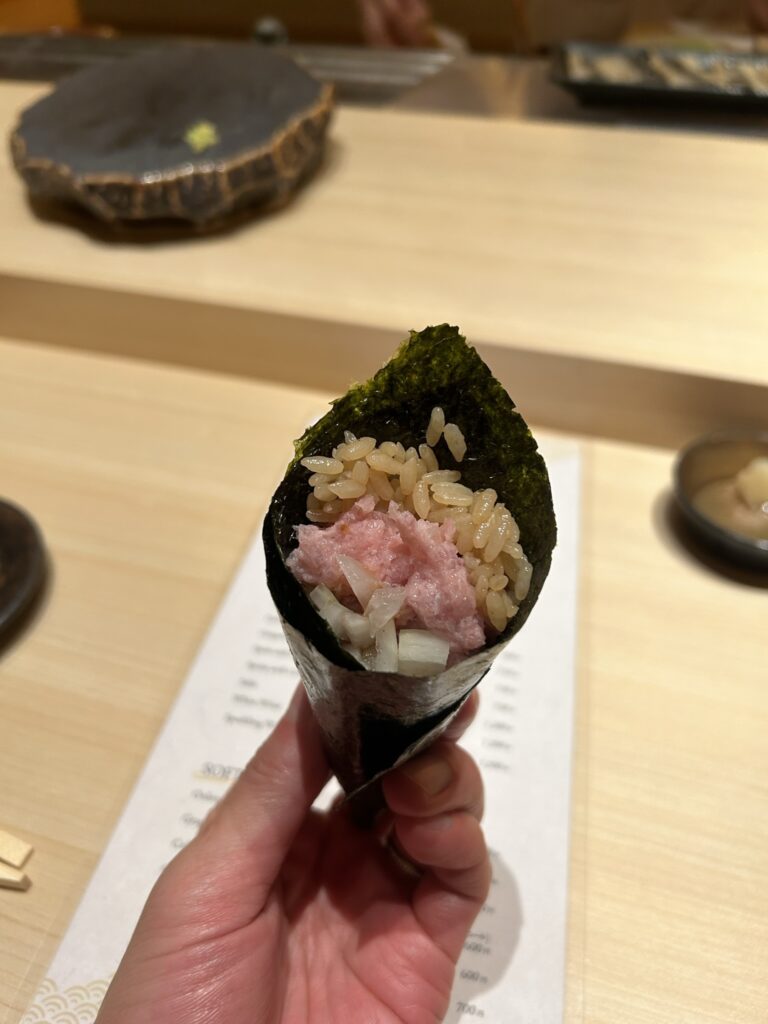 今回、私がここで体験したのは、上品に少しずつ食べる従来の「おまかせ」の概念を覆す食体験だった。 「寿司の間に挟まれる、怒涛の一品料理」 「ネギトロに『玉ねぎ』を入れる大胆な食感設計」