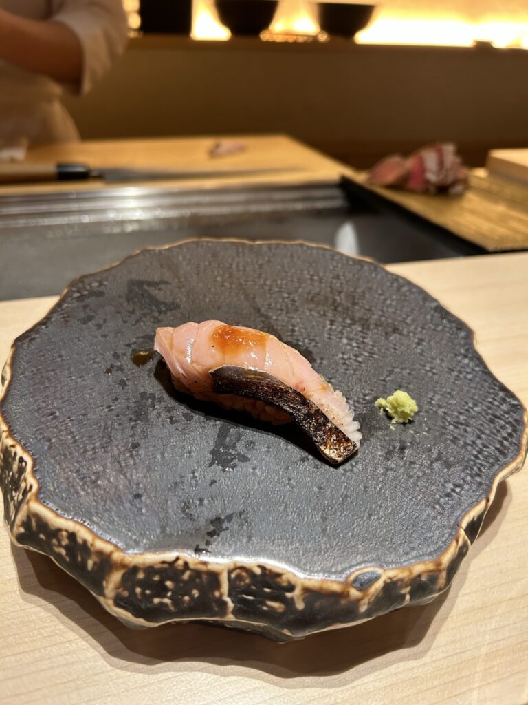 白身魚の炙り 皮目がパリッと炙られ、身はレア。サクサクの皮と濃厚な身のコントラストが見事だった。