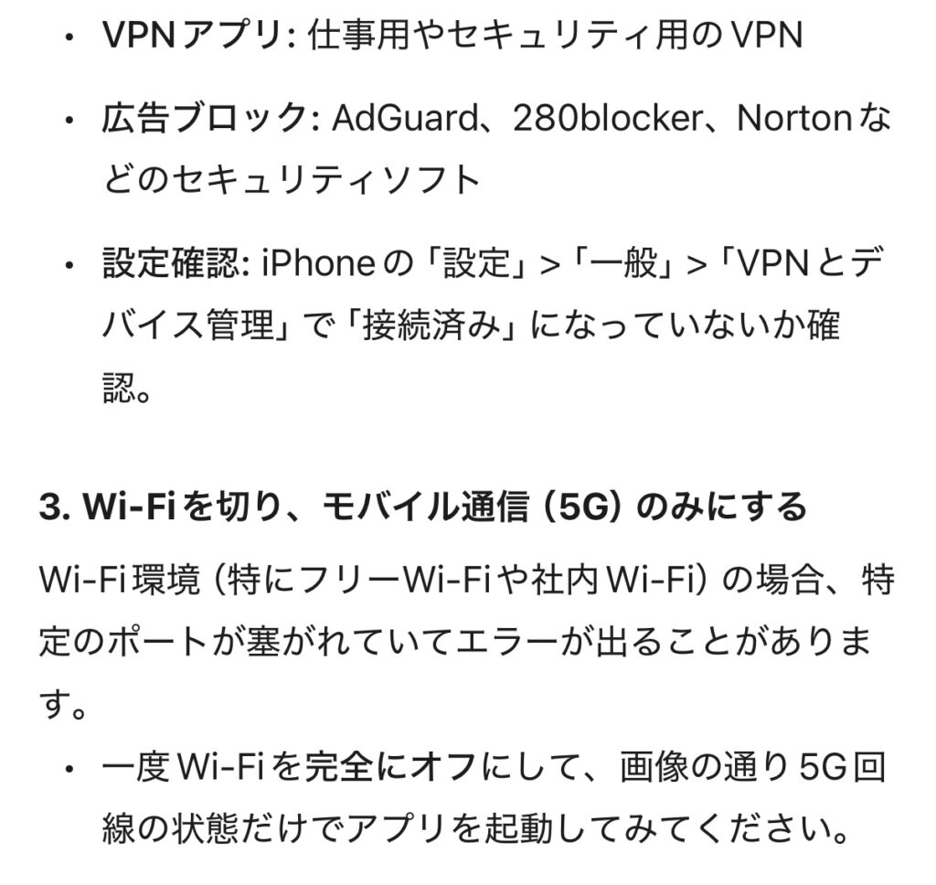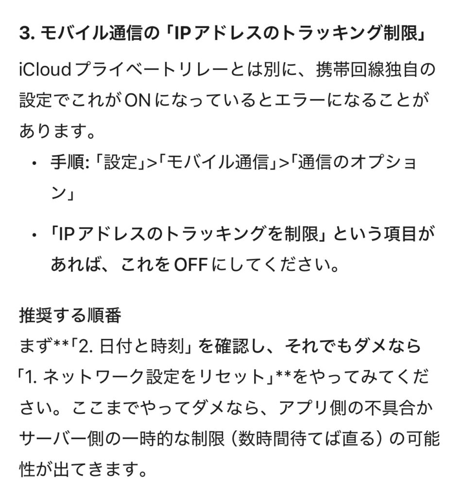 まずは、AIが一般的に推奨するトラブルシューティングをぶつけてきました。 iCloudプライベートリレーのオフや、VPNの確認、トラッキング設定など。私も一つずつ丁寧に潰していきましたが、結果は惨敗です。