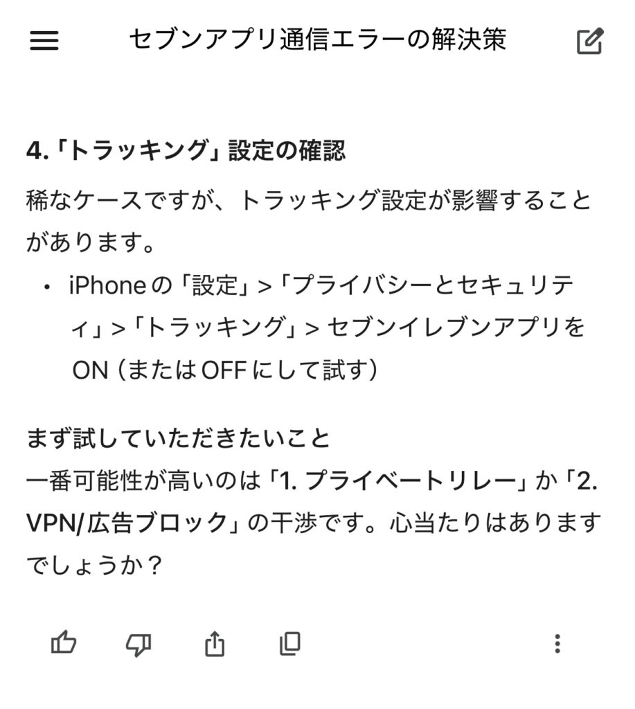 「iPhoneの内部に**『海外通信用の設定ゴミ』**のようなものがネットワーク設定の深層に残ってしまっている可能性が高いです。これがセブンアプリに『不正な通信経路』と誤認させている原因かもしれません。」