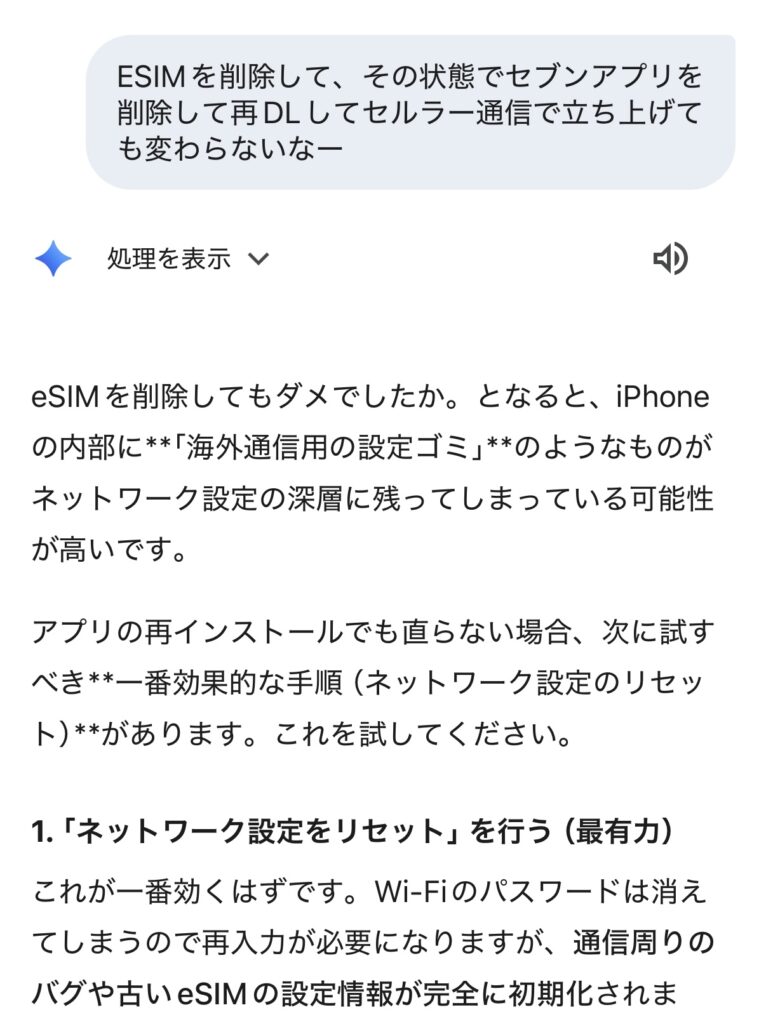 さらには「eSIMの削除」まで実行し、アプリを再インストールしても状況は変わりません。 「もう手詰まりか?」……そんな空気が流れた時、私は最後の手がかりをGeminiに投げました。