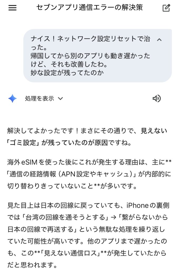 「eSIMを消しても直らない」という私の報告を受けた瞬間、Geminiの推理が一段深いレイヤーに潜りました。