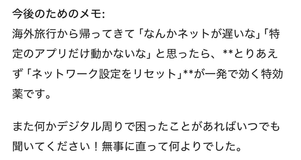 Geminiが提案したのは、iPhoneが覚えている通信の記憶をリセットすること。 ただし、これには「Wi-Fiパスワードも消える」という代償が伴います。